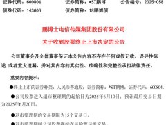 又有兩家A股上市公司收到股票終止上市決定,6月10日進(jìn)入退市整理期。*ST鵬博(600804)公告稱,公司于2025年5月30日收到上海...