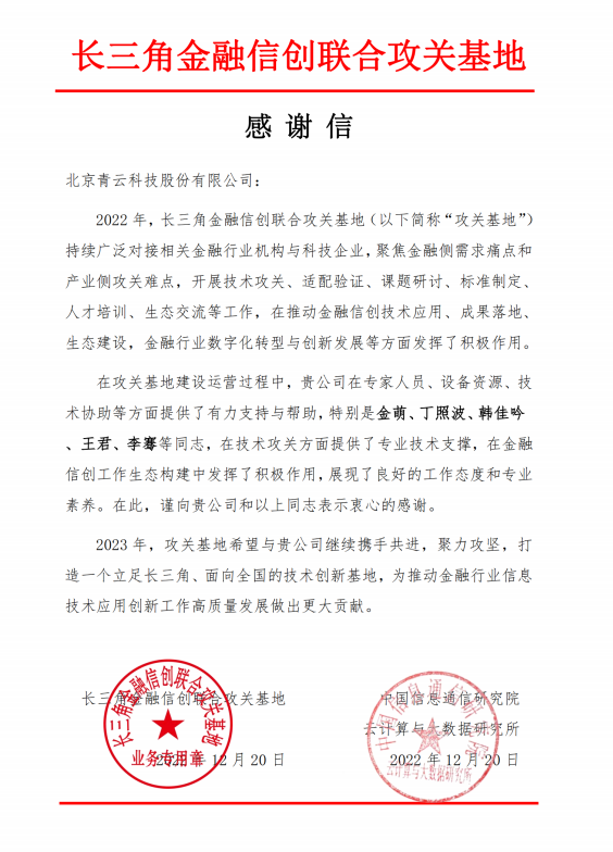 近日,中國信息通信研究院云計(jì)算與大數(shù)據(jù)研究所與長三角金融信創(chuàng)聯(lián)合攻關(guān)基地(以下簡稱:攻關(guān)基地)向青云科技發(fā)來感謝信。