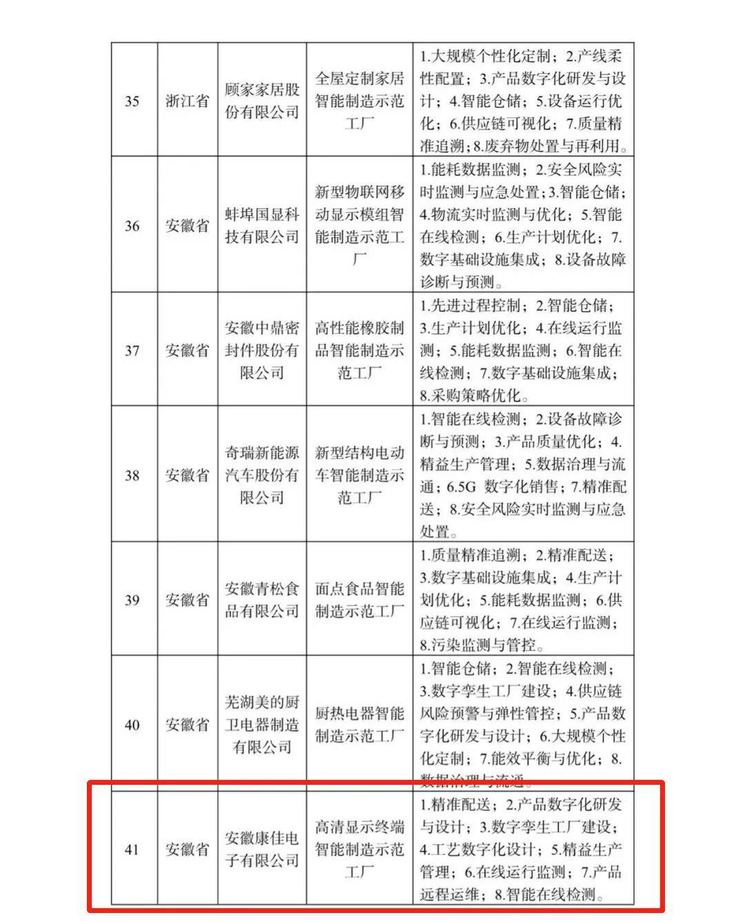 1月3日,國(guó)家工信部、發(fā)改委、財(cái)政部、市監(jiān)總局等四部門(mén)聯(lián)合公布2022年度智能制造示范工廠揭榜單位和優(yōu)秀場(chǎng)景名單,安徽康佳電子有限公司名列其中,成為全國(guó)99個(gè)國(guó)家級(jí)智能制造示范工廠之一。