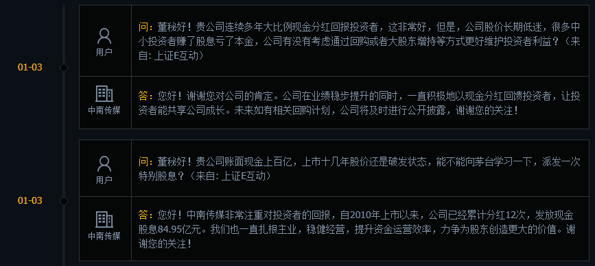 近期,有投資者在互動平臺上提問:“公司連續(xù)多年大比例現(xiàn)金分紅回報(bào)投資者,這非常好,但是公司股價(jià)長期低迷,很多中小投資者賺了股息虧了本金,公司有沒有考慮通過回購或者大股東增持等方式更好維護(hù)投資者利益?”中南傳媒回應(yīng)稱,“未來如有相關(guān)回購計(jì)劃,公司將及時(shí)進(jìn)行公開披露?!?/p>