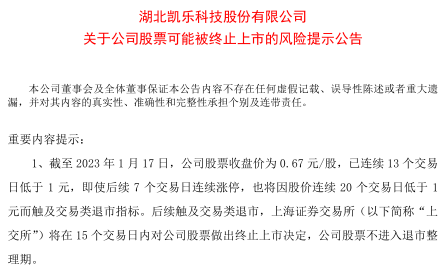 1月17日晚間,*ST凱樂稱,截至1月17日,公司股票收盤價(jià)為0.67元/股,已連續(xù)13個(gè)交易日低于1元,即使后續(xù)7個(gè)交易日連續(xù)漲停,也將因股價(jià)連續(xù)20個(gè)交易日低于1元而觸及交易類退市指標(biāo)。后續(xù)觸及交易類退市,上交所將在15個(gè)交易日內(nèi)對(duì)公司股票做出終止上市決定,公司股票不進(jìn)入退市整理期。