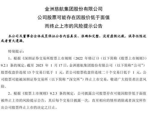 值得注意的是,1月17日晚間,深市也有一家公司就面值退市風(fēng)險(xiǎn)發(fā)布公告。*ST金洲(000587)稱,截至1月17日,公司股票收盤價(jià)連續(xù)13個(gè)交易日低于1元,若公司股票收盤價(jià)連續(xù)20個(gè)交易日低于1元,公司股票可能被深交所終止上市交易。