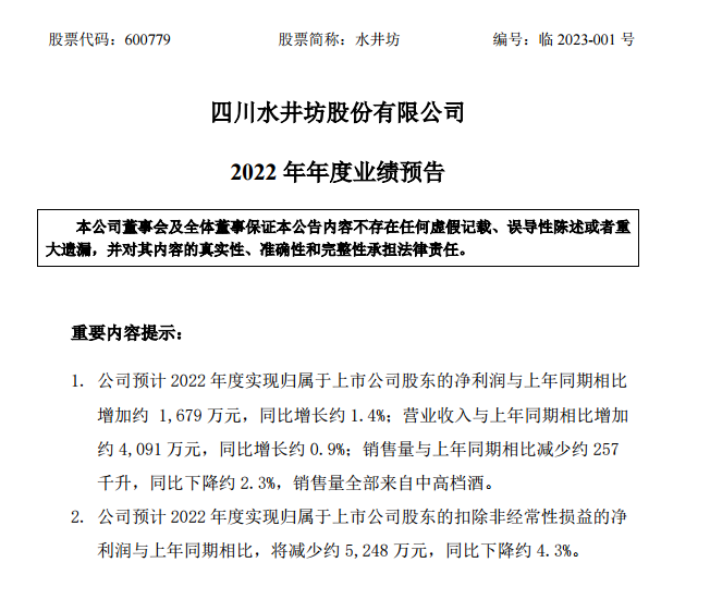 水井坊的業(yè)績預(yù)告顯示,公司預(yù)計(jì)2022年度實(shí)現(xiàn)歸屬于上市公司股東的凈利潤與上年同期相比增加約1679萬元,同比增長約1.4%;營業(yè)收入與上年同期相比增加約4091萬元,同比增長約0.9%。