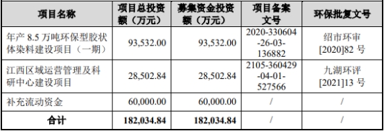 博澳股份原擬在上交所主板發(fā)行股數(shù)不超過133,333,300股,占本次發(fā)行后公司總股本的比例不低于10%且不高于發(fā)行后總股本的25%。公司擬募集資金182,034.84萬元,分別用于年產(chǎn)8.5萬噸環(huán)保型膠狀體染料建設(shè)項(xiàng)目(一期)、江西區(qū)域運(yùn)營管理及科研中心建設(shè)項(xiàng)目、補(bǔ)充流動(dòng)資金。