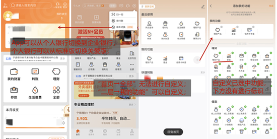 值得注意的是,用戶下拉屏幕可以進入“二樓”查看/編輯功能組件,包括我的功能、快捷轉(zhuǎn)賬、最近使用、自選基金和熱門活動。其中,“我的功能”支持用戶自定義0-4個常用功能,但實際僅可顯示3個,自定義旅程也有優(yōu)化空間:已經(jīng)選中的功能,“全部功能”中沒有進行標識。