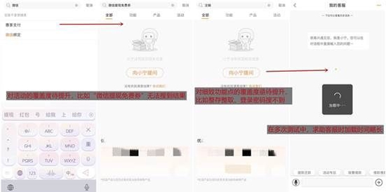 相比2021年評測,搜索體驗提升不大,仍需進一步優(yōu)化:一是,關(guān)鍵詞測試中,諸如登錄密碼、注銷、整存整取等細致功能搜不到結(jié)果;二是,對活動的覆蓋度待提升,比如熱榜中的“微信提現(xiàn)免費券”無法搜到結(jié)果;三是,若用戶求助智能客服,載入時間比較長。
