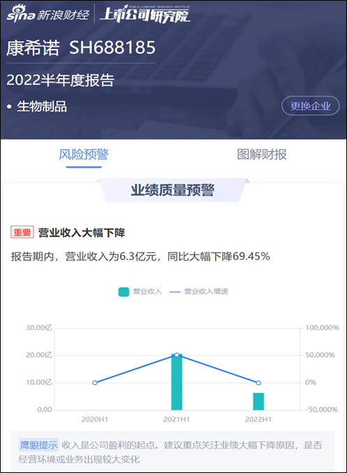 以上均可以從康希諾2022年半年報(bào)得到驗(yàn)證。鷹眼預(yù)警顯示,2022年半年報(bào)報(bào)告期內(nèi),公司營業(yè)收入為6.3億元,同比大幅下降69.45%。對此,鷹眼預(yù)警發(fā)出提示,建議重點(diǎn)關(guān)注公司業(yè)績大幅下降原因,是否經(jīng)營環(huán)境或業(yè)務(wù)出現(xiàn)較大變化。