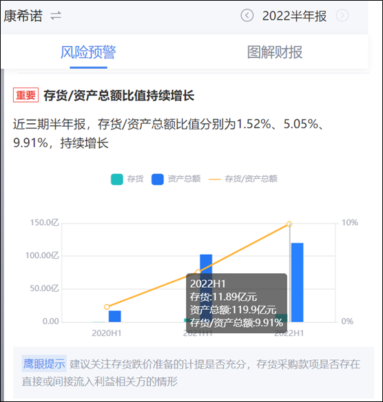 需要指出的是,疫苗由于有時效性,在需求大幅放緩之際,過高的存貨存在較大的減值風(fēng)險(xiǎn)。值得主要的是,鷹眼預(yù)警顯示,公司的存貨呈現(xiàn)出持續(xù)走高態(tài)勢。2022年半年報(bào),公司存貨占資產(chǎn)之比為9.91%,金額高達(dá)11.89億元。截止2022年三季報(bào)末,公司存貨降至8.8億元。從中或可以看出,康希諾下半年虧損或一大部分由存貨計(jì)提減值所致。