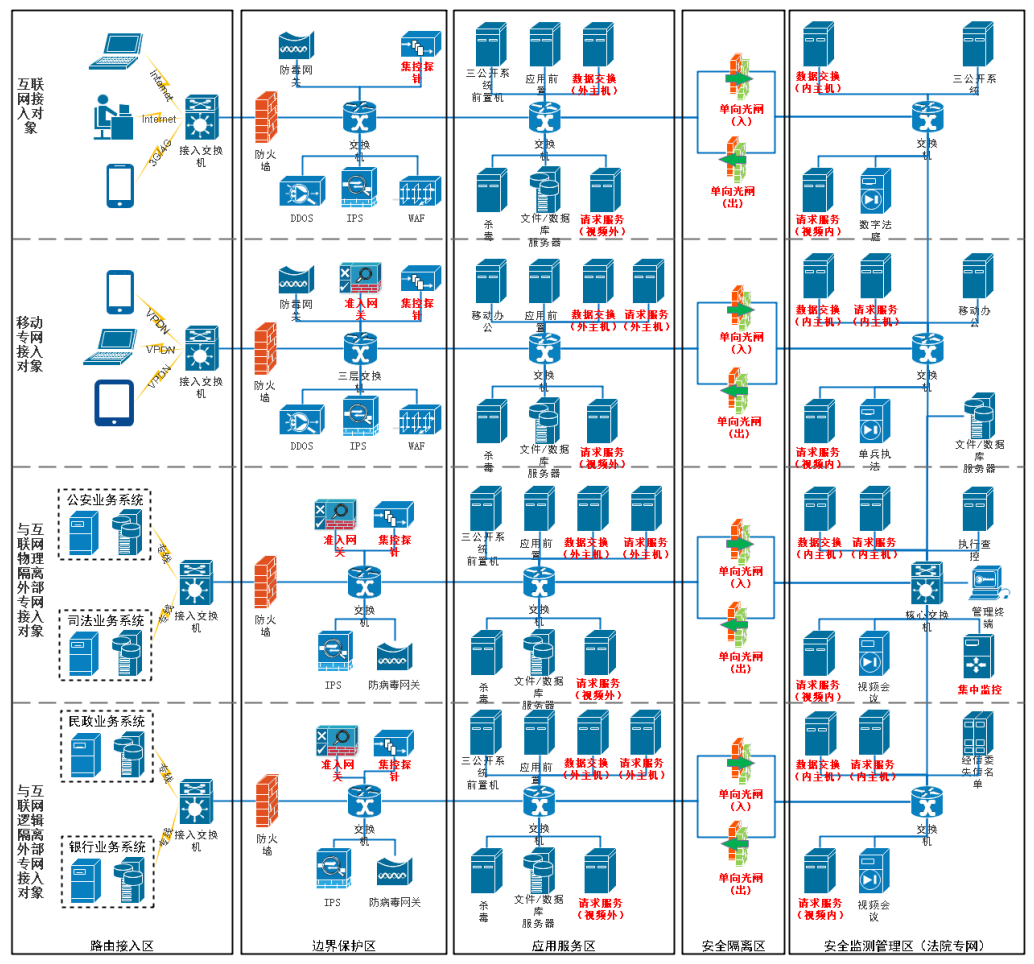 2、外部專網(與互聯(lián)網物理隔離)接入對象:主要實現(xiàn)與公安部門、檢察院、司法等部門的業(yè)務安全數(shù)據交換。