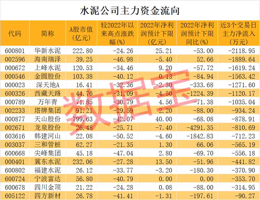 從資金面上來(lái)看,上述21家水泥公司中,兔年春節(jié)以來(lái)的3個(gè)交易日,7家公司主力凈流出額逾千萬(wàn)元。其中金圓股份(000546)近3個(gè)交易日主力資金均為凈流出狀態(tài),合計(jì)凈流出達(dá)到1563萬(wàn)元。與2022年以來(lái)高點(diǎn)相比,公司股價(jià)累計(jì)回撤幅度40.12%。