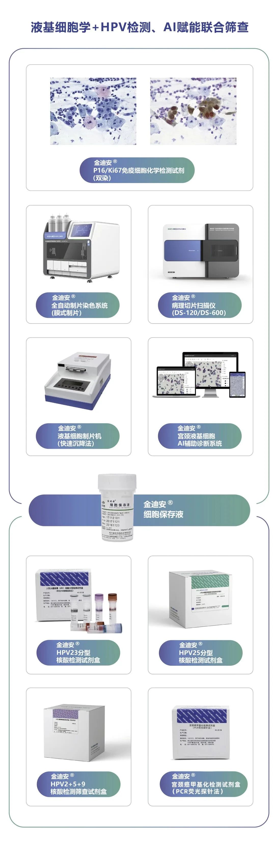 針對(duì)HPV病毒檢測(cè),迪安生物可提供包含HPV檢測(cè)、液基細(xì)胞學(xué)檢測(cè)、AI輔助閱片系統(tǒng)的宮頸癌篩查整體解決方案。產(chǎn)品包括金迪安 人乳頭瘤病毒(HPV)核酸檢測(cè)、液基細(xì)胞學(xué)檢測(cè)系列產(chǎn)品,可實(shí)現(xiàn)從樣本采樣保存、HPV病毒核酸檢測(cè)及結(jié)果判讀、液基細(xì)胞制片染色及掃描+AI快速識(shí)別病變細(xì)胞的檢測(cè)全流程,為實(shí)現(xiàn)我國(guó)女性宮頸健康管理新目標(biāo)助力。