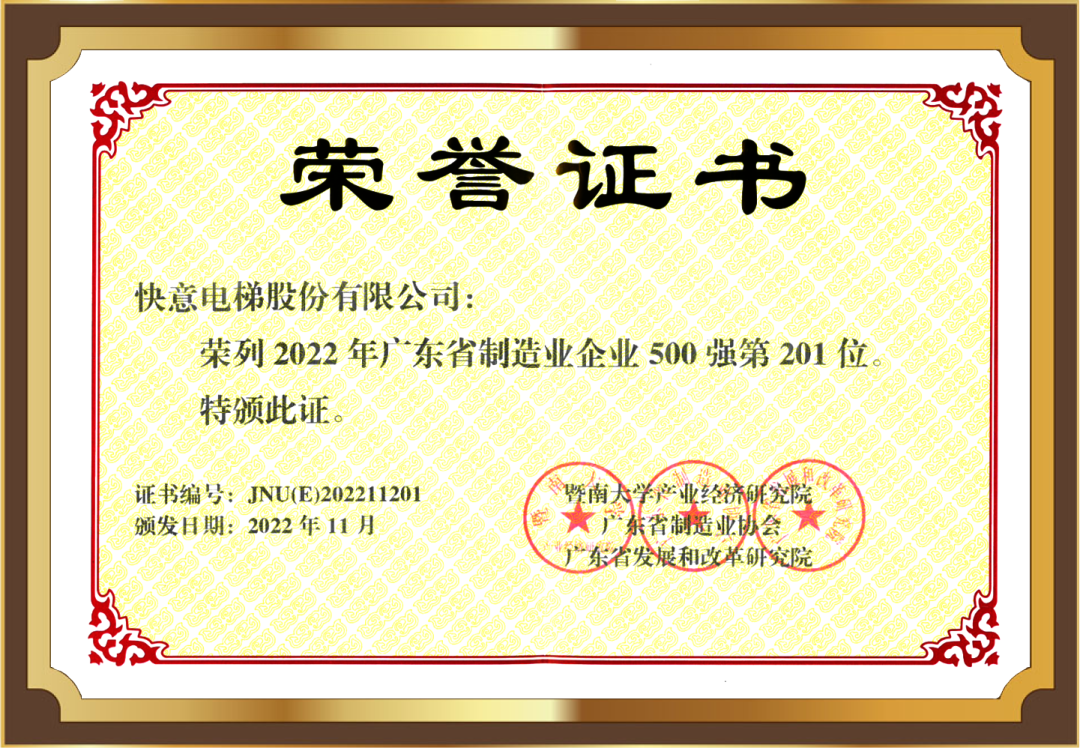繼連續(xù)兩年榮登“中國(guó)電梯制造商10強(qiáng)”榜單后,近期,快意電梯(002774)榮登2022年廣東省制造業(yè)企業(yè)500強(qiáng)榜單,位列第201位。