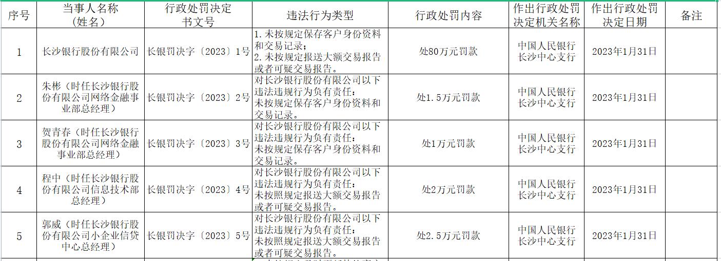 朱彬(時(shí)任長(zhǎng)沙銀行股份有限公司網(wǎng)絡(luò)金融事業(yè)部總經(jīng)理)對(duì)長(zhǎng)沙銀行股份有限公司以下違法違規(guī)行為負(fù)有責(zé)任:未按規(guī)定保存客戶身份資料和交易記錄。中國(guó)人民銀行長(zhǎng)沙中心支行對(duì)朱彬處1.5萬(wàn)元罰款。