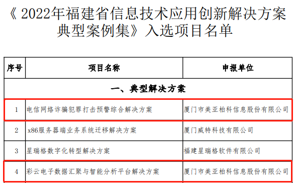 近日,福建省數(shù)字福建建設領導小組辦公室公布關于《2022年福建省信息技術應用創(chuàng)新解決方案典型案例集》入選項目名單。經(jīng)過材料初篩、專家評審、網(wǎng)上公示等程序嚴格篩選,美亞柏科(300188)“電信網(wǎng)絡詐騙犯罪打擊預警綜合解決方案”、“彩云電子數(shù)據(jù)匯聚與智能分析平臺解決方案”入選典型解決方案。