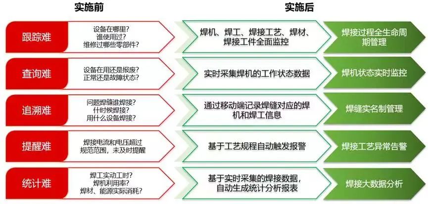 通過這一系統(tǒng)的應(yīng)用,只需要在屏幕上即可一覽車間所有焊機(jī)的實(shí)時(shí)工作狀態(tài),并實(shí)現(xiàn)焊接全生命周期的監(jiān)測和管理,實(shí)現(xiàn)焊縫實(shí)名制管理、焊接質(zhì)量追溯、焊接過程遠(yuǎn)程監(jiān)控和焊接大數(shù)據(jù)分析,同時(shí)為管理者對人員和設(shè)備績效的考核、焊接工藝質(zhì)量分析、生產(chǎn)過程的資源調(diào)度優(yōu)化、設(shè)備的運(yùn)行維護(hù)提供重要的支撐數(shù)據(jù)。