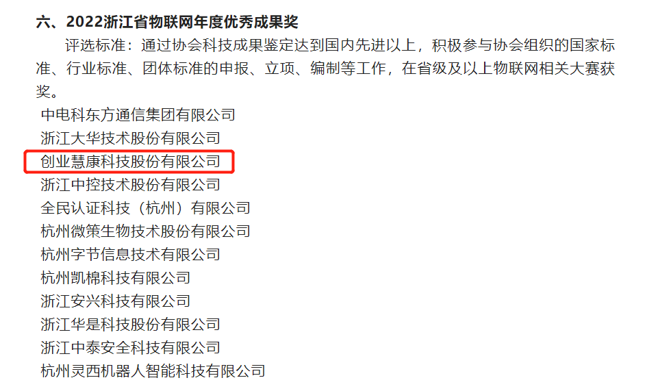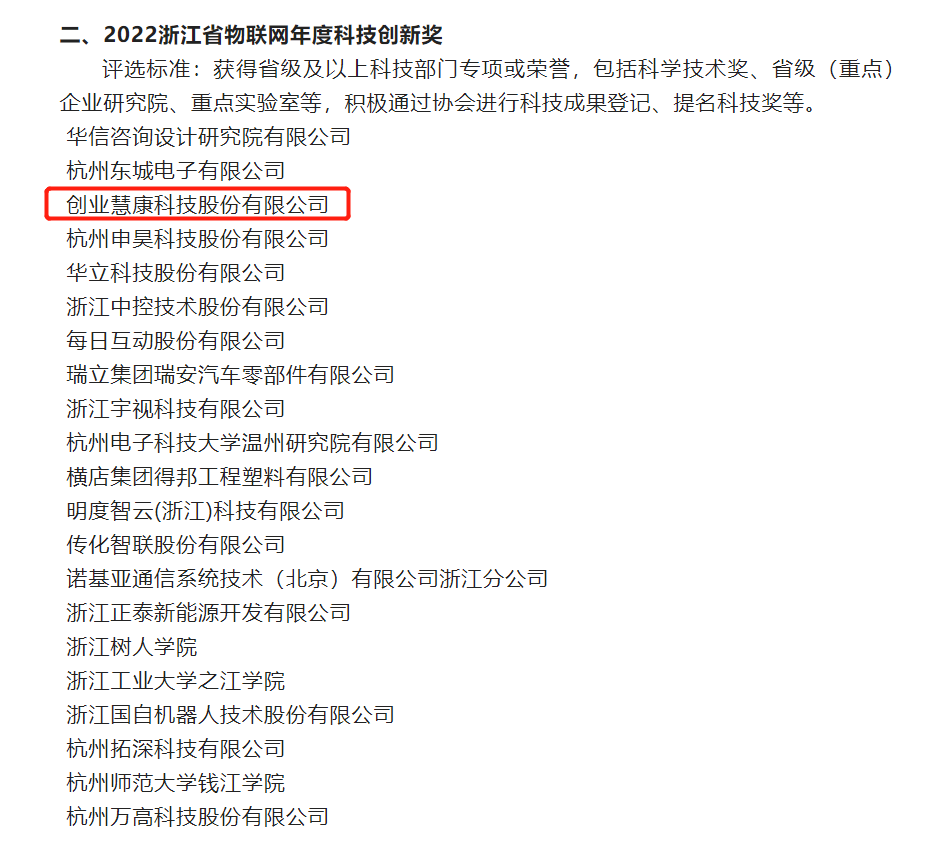 近日,浙江省物聯(lián)網(wǎng)產(chǎn)業(yè)協(xié)會(huì)公布了《關(guān)于2022浙江省級(jí)物聯(lián)網(wǎng)年度獎(jiǎng)項(xiàng)候選單位的公示》名單,創(chuàng)業(yè)慧康(300451)憑借在物聯(lián)網(wǎng)領(lǐng)域的突出表現(xiàn)和創(chuàng)新能力,榮獲2022浙江省物聯(lián)網(wǎng)年度“科技創(chuàng)新獎(jiǎng)”和“優(yōu)秀成果獎(jiǎng)”兩項(xiàng)榮譽(yù)。