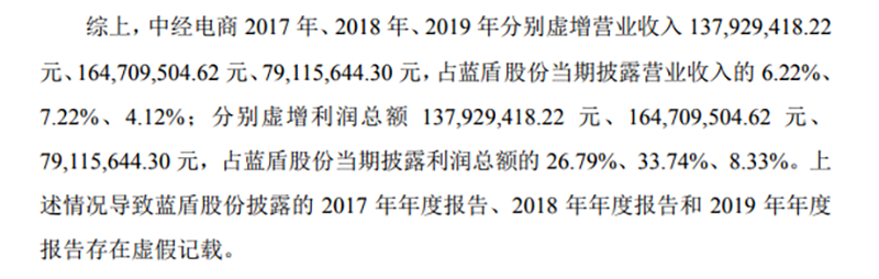 2022年8月,廣東證監(jiān)局下發(fā)的行政處罰決定書顯示,*ST藍盾(原藍盾股份)子公司中經(jīng)匯通電子商務(wù)有限公司(以下簡稱中經(jīng)電商)2017至2019年分別虛增利潤總額1.38億元、1.65億元和7911.6萬元,占*ST藍盾當(dāng)期披露利潤總額的26.79%、33.74%、8.33%。上述情況導(dǎo)致*ST藍盾披露的2017年年度報告、2018年年度報告和2019年年度報告存在虛假記載。