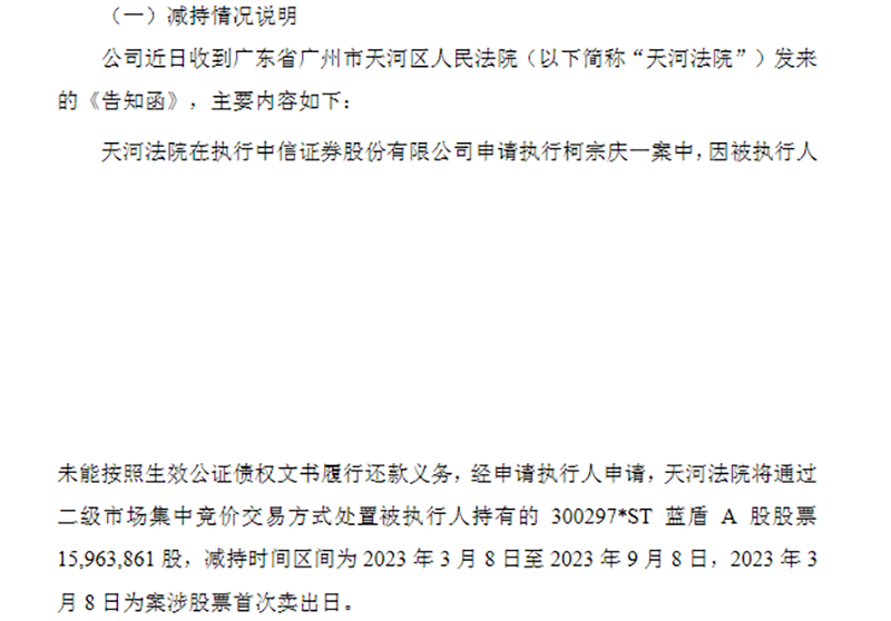 2月15日,*ST藍盾已發(fā)布控股股東所持部分股份被動減持的預(yù)披露公告。根據(jù)公告,*ST藍盾控股股東、實際控制人柯宗慶計劃以集中競價方式被動減持公司股份約1596.4萬股,占公司總股本的1.28%。減持時間區(qū)間為2023年3月8日至2023年9月8日。