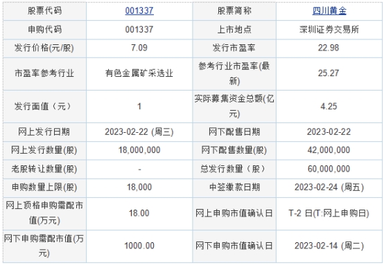 四川黃金2023年2月21日披露的首次公開發(fā)行股票發(fā)行公告顯示,按本次發(fā)行價(jià)格7.09元/股,公司預(yù)計(jì)募集資金42,540.00萬元,扣除預(yù)計(jì)發(fā)行費(fèi)用3,517.29萬元后,預(yù)計(jì)募集資金凈額為39,022.71萬元。