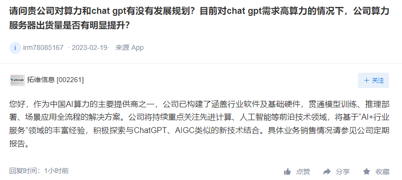 中國財(cái)富通2月22日 - 拓維信息(002261)(002261)在互動平臺上表示,作為中國AI算力的主要提供商之一,公司已構(gòu)建了涵蓋行業(yè)軟件及基礎(chǔ)硬件,貫通模型訓(xùn)練、推理部署、場景應(yīng)用全流程的解決方案。公司將持續(xù)重點(diǎn)關(guān)注先進(jìn)計(jì)算、人工智能等前沿技術(shù)領(lǐng)域,將基于“AI+行業(yè)服務(wù)”領(lǐng)域的豐富經(jīng)驗(yàn),積極探索與ChatGPT、AIGC類似的新技術(shù)結(jié)合。