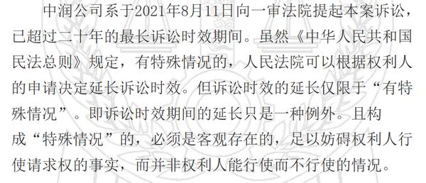 近日,該案迎來終審判決。法院認(rèn)定,中潤公司怠于行使自身權(quán)利,已超過20年的最長訴訟時(shí)效,遂駁回中潤公司訴訟。