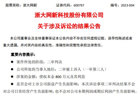 2023年2月16日,浙大網(wǎng)新發(fā)布公告稱,本次訴訟事項(xiàng)二審判決結(jié)果不會(huì)對(duì)公司日常經(jīng)營產(chǎn)生負(fù)面影響,也不會(huì)對(duì)公司本期利潤或期后利潤產(chǎn)生負(fù)面影響。