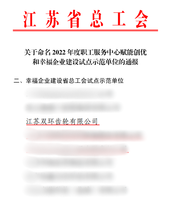 近日,江蘇省總工會辦公室印發(fā)通知,公布了2022 年度幸福企業(yè)江蘇省總工會試點(diǎn)示范單位名單。江蘇雙環(huán)經(jīng)過自評、初審、調(diào)研評估和集中評審后,成功入選江蘇省第一批“幸福企業(yè)試點(diǎn)示范單位”。