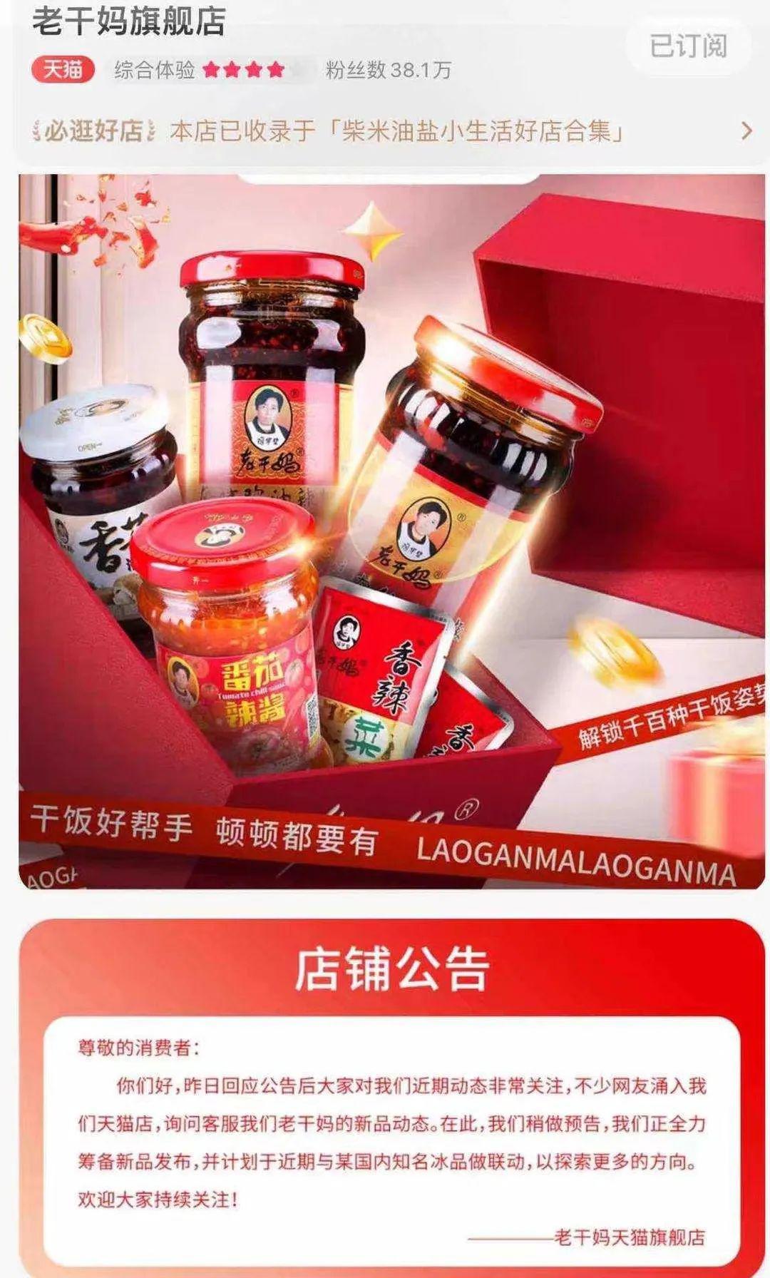 3月17日,老干媽天貓旗艦店發(fā)公告稱,正全力籌備新品發(fā)布,并計劃于近期與國內(nèi)知名冰品做聯(lián)動,以探索更多的方向。