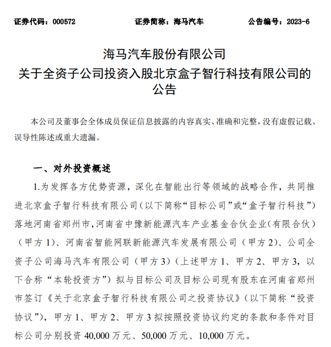 3月23日,海馬汽車(000572)公告顯示,擬投資入股北京盒子智行科技有限公司。
