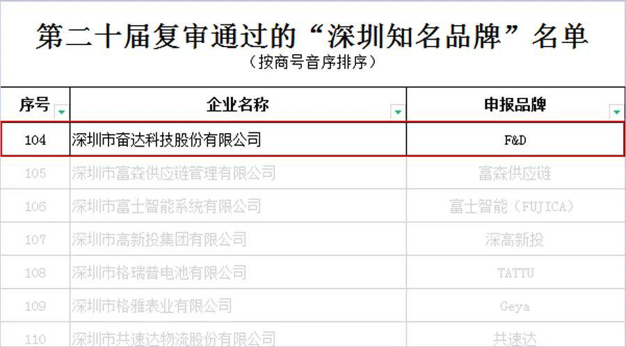 2022年3月,第二十屆“深圳知名品牌”培育評價活動開啟,奮達科技(002681)旗下自有品牌“F&D”通過復審,繼續(xù)入選該名單。