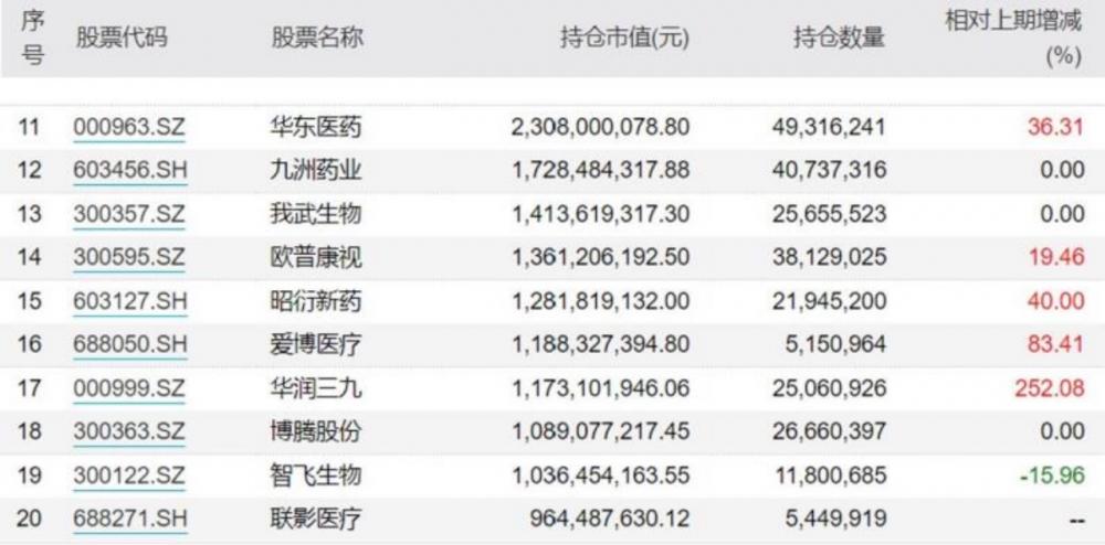 年報顯示,該基金第11名至第20名隱形重倉股為華東醫(yī)藥、九洲藥業(yè)(603456)、我武生物(300357)、歐普康視、昭衍新藥、愛博醫(yī)療、華潤三九、博騰股份(300363)、智飛生物(300122)、聯(lián)影醫(yī)療。