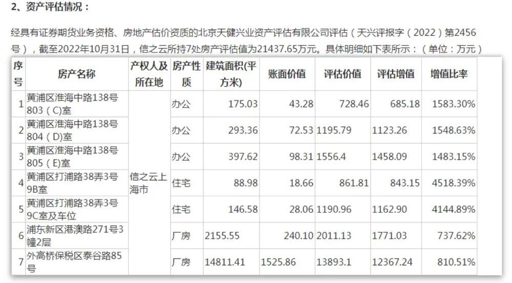 對(duì)此,ST國(guó)安在公告中直言,截至評(píng)估基準(zhǔn)日2022年10月31日,上述房產(chǎn)增值率957.71%,主要原因?yàn)樾胖迫〉蒙鲜龇慨a(chǎn)時(shí)間較早,且按取得時(shí)的成本確認(rèn)為投資性房地產(chǎn)項(xiàng)目,采用成本模式計(jì)量,按會(huì)計(jì)期間計(jì)提折舊,賬面凈值逐年減少;而近年來(lái)上海房?jī)r(jià)漲幅較大,市場(chǎng)可比價(jià)格較上述房產(chǎn)的賬面凈值有較大增幅,因此評(píng)估值較房產(chǎn)賬面價(jià)值增加的幅度較大。