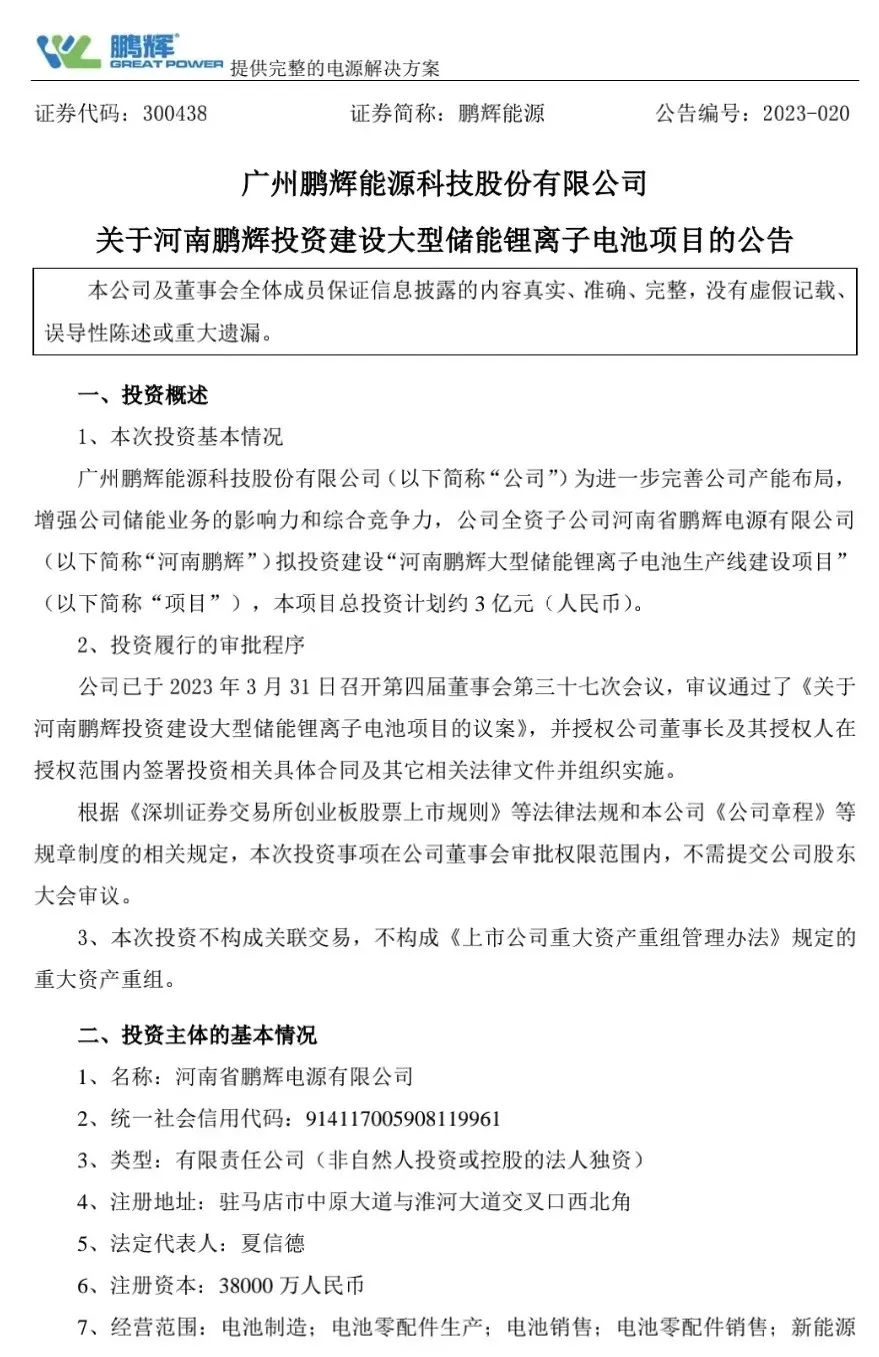 當(dāng)天,鵬輝能源董事會(huì)會(huì)議還審議通過了《關(guān)于河南鵬輝投資建設(shè)大型儲(chǔ)能鋰離子電池項(xiàng)目的議案》。為進(jìn)一步完善公司產(chǎn)能布局,公司全資子公司河南省鵬輝電源有限公司擬投資建設(shè)河南鵬輝大型儲(chǔ)能鋰離子電池生產(chǎn)線建設(shè)項(xiàng)目。