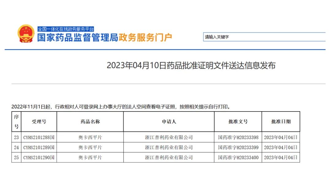 4月10日,浙江普利藥業(yè)收到國家藥監(jiān)局簽發(fā)的普利舒奧 奧卡西平片上市許可,視同通過仿制藥一致性評價,成為國內本品種首家過評企業(yè)。