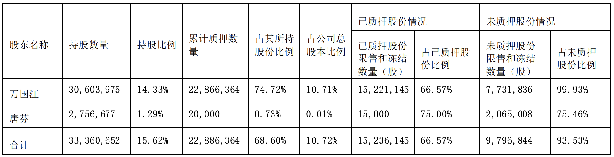 董事長質(zhì)押股份高企。截至公告披露當(dāng)晚,擔(dān)任科恒股份董事長一職的萬國江已質(zhì)押股份限售和凍結(jié)數(shù)量達(dá)1522.1145萬股,占已質(zhì)押股份比例的66.57%。另外,公司股東唐芬自有0.73%的股份也處于質(zhì)押狀態(tài)。整體來看,科恒股份公司有逾10%的總股本處于質(zhì)押狀態(tài)。而對于此次董事長質(zhì)押,公司的表態(tài)是,對公司經(jīng)營水平無重大影響,股東也具備償還能力。