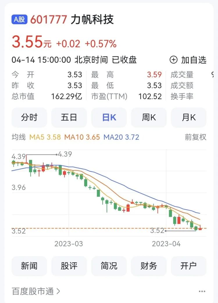 4月14日,力帆科技報收3.55元,漲0.57%,換手率0.22%,總市值162.29億元。