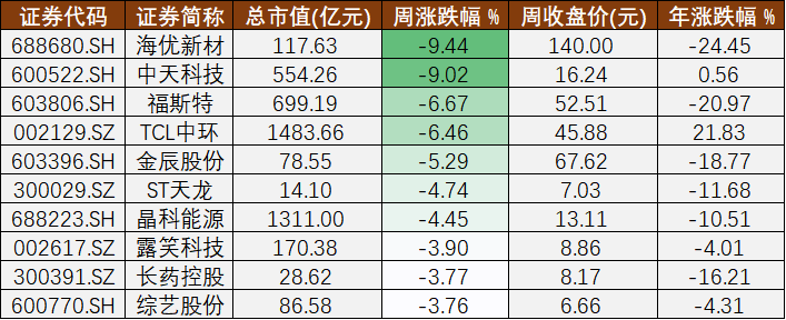 本周股價(jià)周跌幅居前的十家A股光伏公司 制圖: