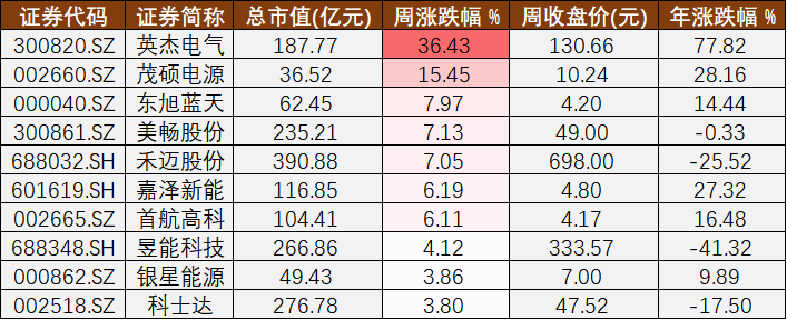 其中,英杰電氣(300820)(300820.SZ)、茂碩電源(002660)(002660.SZ)、東旭藍(lán)天(000040)(000040.SZ)在板塊內(nèi)領(lǐng)漲,周漲幅為36.43%、15.45%、7.97%。