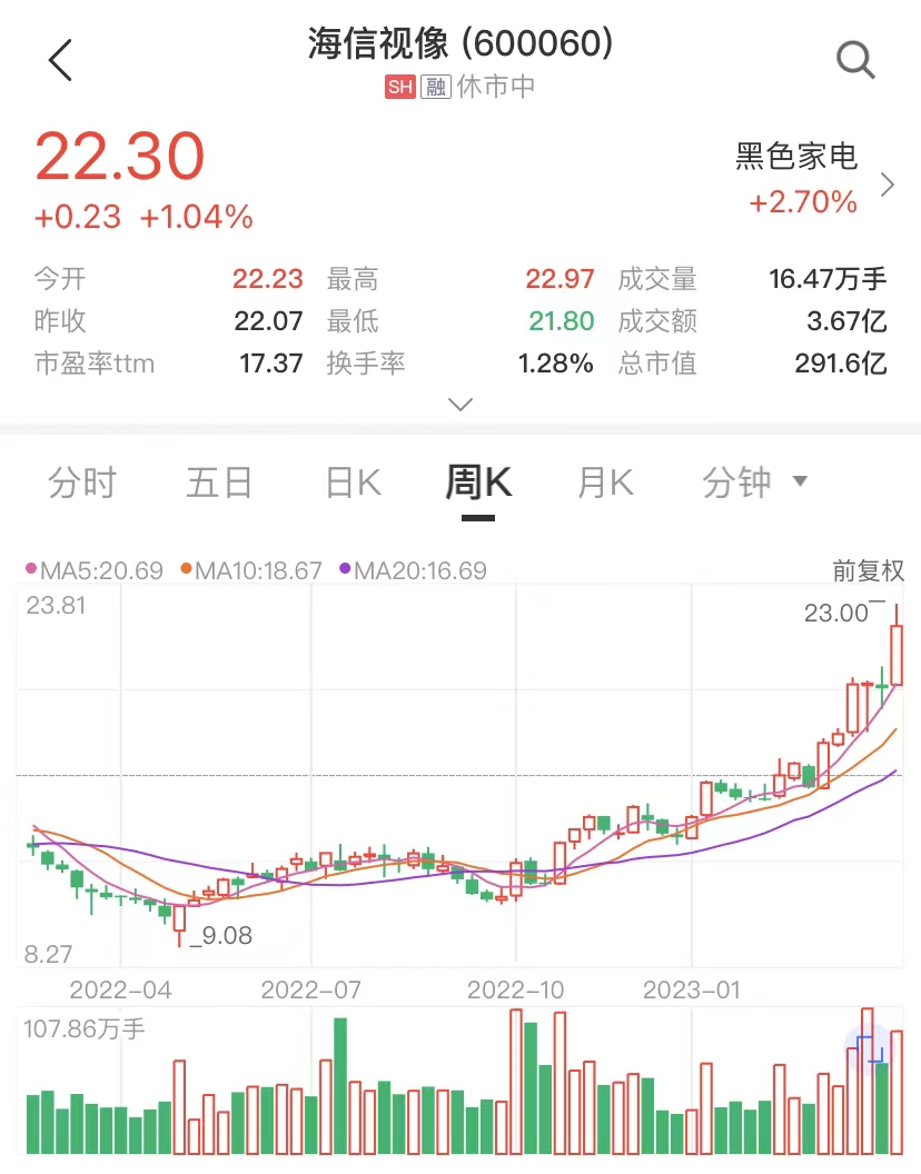 股價方面,海信視像自去年4月27日創(chuàng)出階段性低點9.05元以來,截至今年4月28日收盤,股價報22.3元/股,一年來漲幅高達146%。業(yè)內(nèi)人士分析,海信視像亮眼業(yè)績的背后,得益于公司全場景顯示戰(zhàn)略的布局升級,特別是高端化、全球化的加速推進。