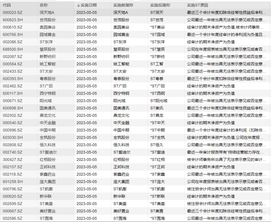 根據(jù)數(shù)據(jù)顯示,僅5月5日一天實施戴帽(不含ST變?yōu)?ST)的就多達29只。包括深天地A、世茂股份(600823)、奧園美谷(000615)、園城黃金(600766)等等。