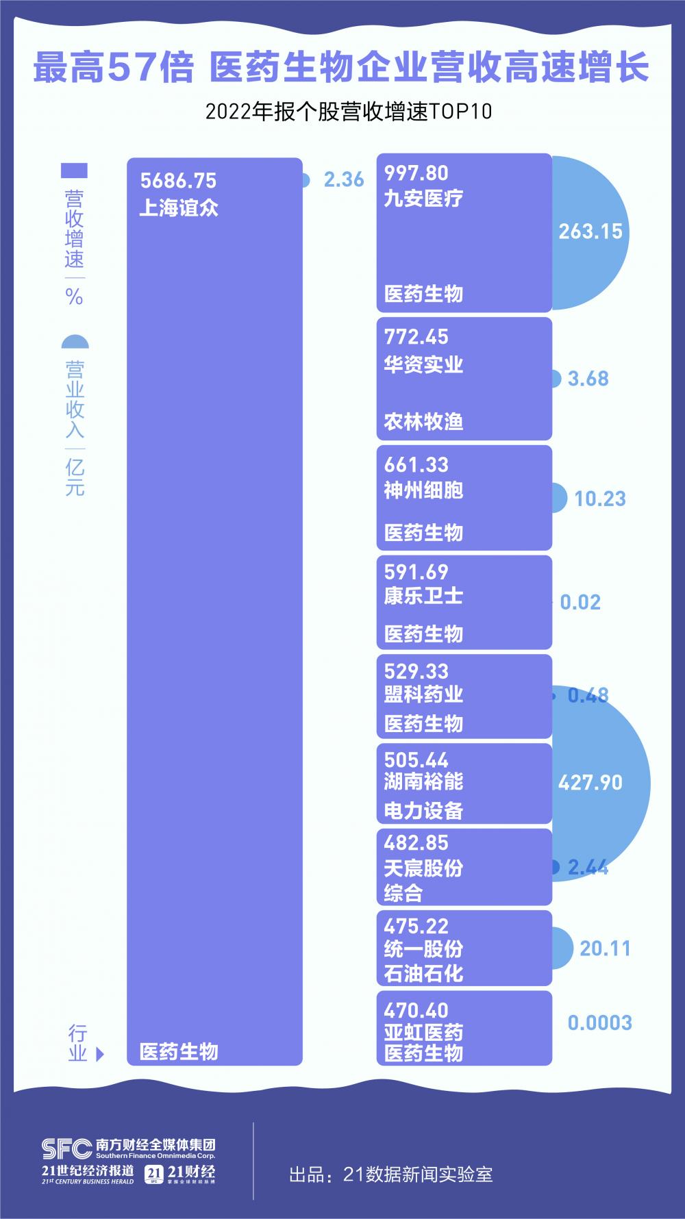 在個股營收增速TOP10中,以上海誼眾為代表的多家醫(yī)藥生物企業(yè)表現(xiàn)亮眼,有55家營收規(guī)模突破百億元,16家營收增速超過100%,板塊整體業(yè)績較為樂觀且好于預期。