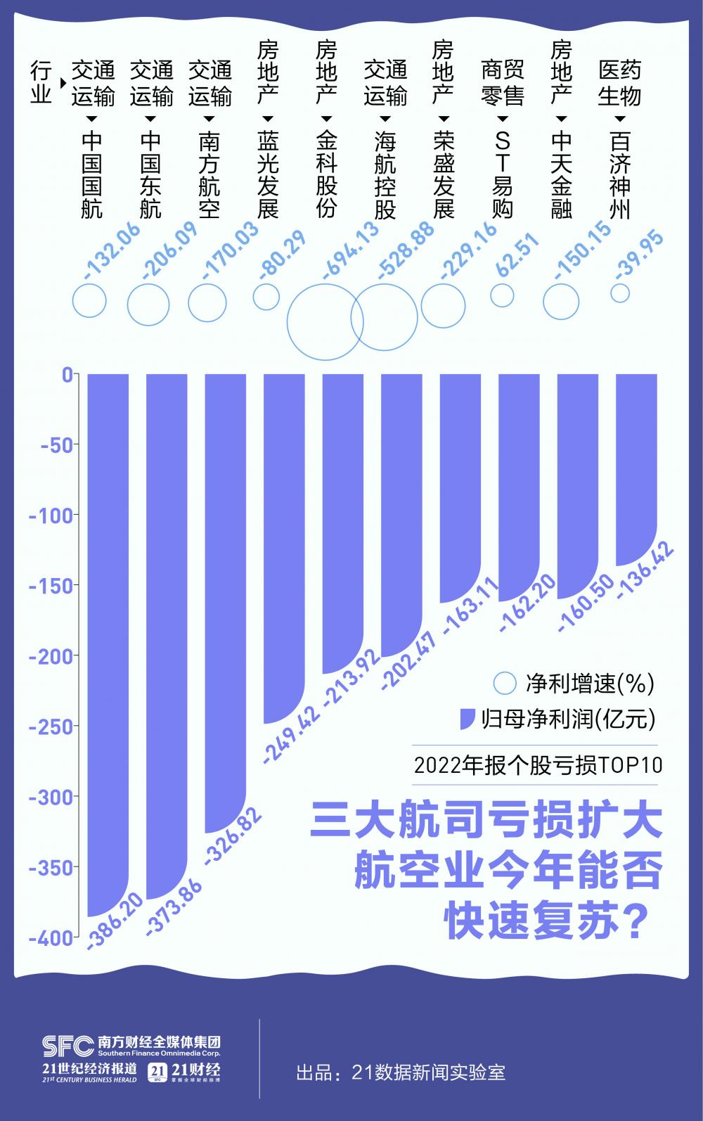 在個股虧損TOP10中,有5家公司來自航空業(yè)。作為國內(nèi)航空業(yè)代表的“三大航司”,中國國航(601111)、中國東航(600115)、南方航空(600029)2022年虧損額繼續(xù)擴大,均超過300億元,刷新最高虧損記錄。此外,海航控股(600221)由盈轉(zhuǎn)虧,凈利同比下滑529%,錄得202億元凈虧損。