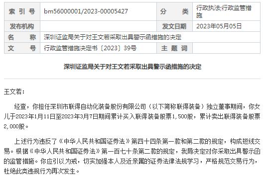5月5日,深圳證監(jiān)局公告,對聯(lián)得裝備(300545)獨立董事王文若出具警示函,指出其親屬違規(guī)買賣上市公司股票。