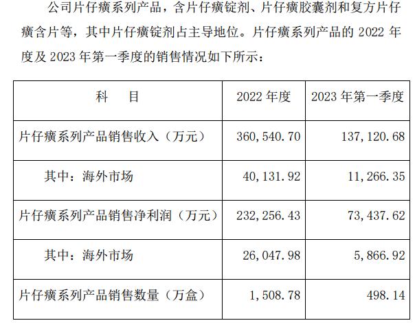 在本次的公告披露中,公司表示,片仔癀系列產(chǎn)品的2022年度及2023年第一季度的銷售情況如下所示: