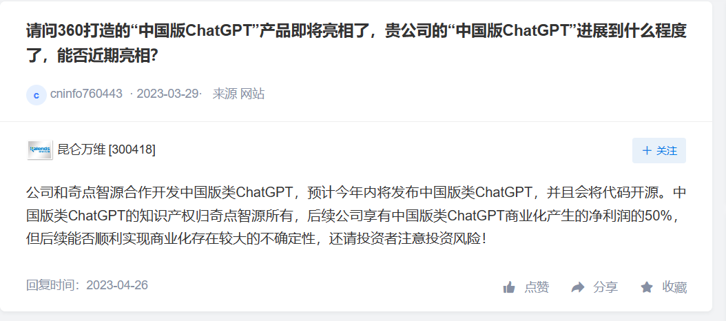 5 月 6 日消息,昆侖萬(wàn)維(300418)(300418)在投資者互動(dòng)平臺(tái)回復(fù)了投資者感興趣的問(wèn)題。