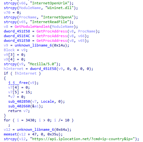 ③將上一步獲取到的外網(wǎng)IP地址在(api.iplocation.net,ipapi.co等)Web服務中查詢所屬國家的名稱。