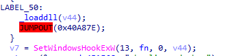 5、使用SetWindowsHookExW注冊鍵盤鉤子,將捕獲到的鍵盤記錄以文本的方式保存在%temp%目錄下的kednfbdnfby.dat文件中。