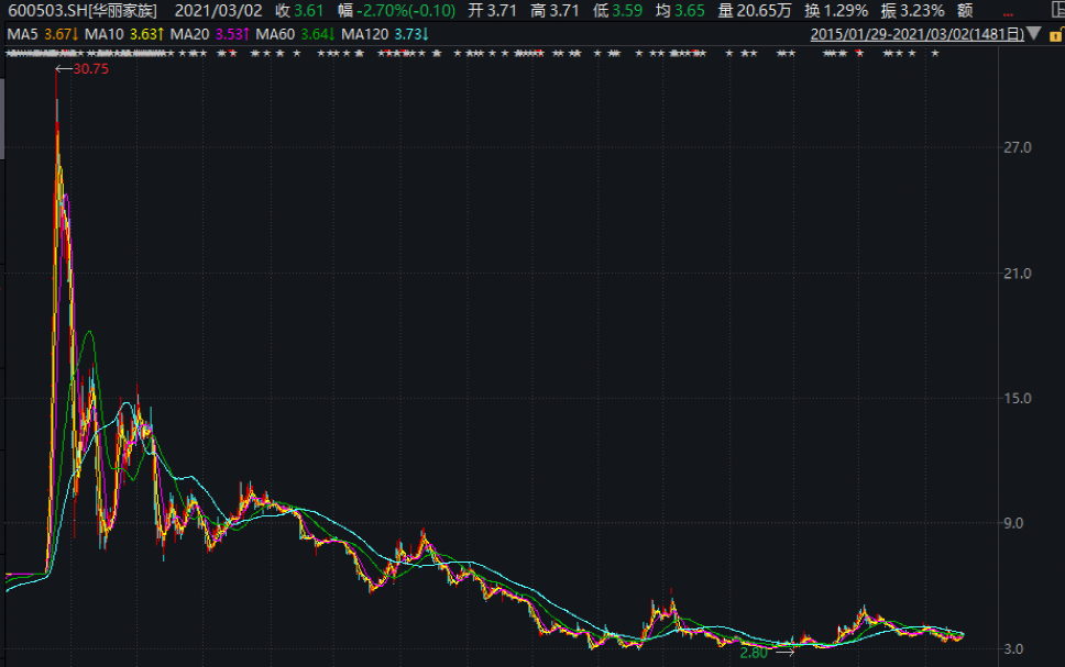 華麗家族在2015年的股價最高達(dá)30.75元,隨后不斷下跌,已經(jīng)淪為2元股多年,澤熙系持股市值已跌至2億元。