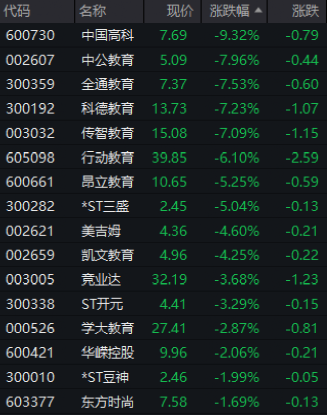 教育板塊繼續(xù)下挫,中國高科(600730)一度跌停,中公教育(002607)、全通教育(300359)、科德教育(300192)、跌逾7%。